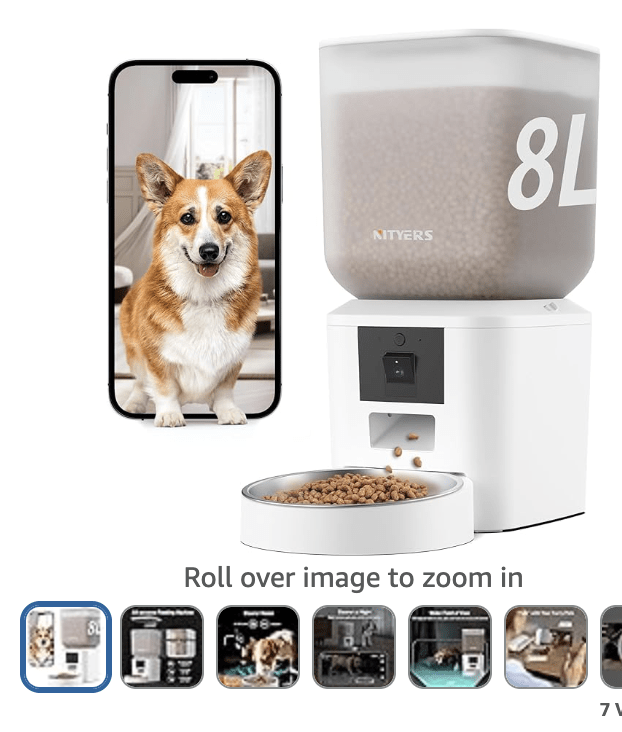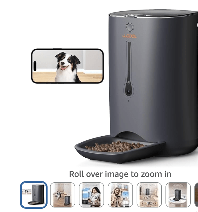 An Dog Feeder with Camera available on Amazon to get an idea about what they look like: WOPET 7L Automatic Dog Feeder with Camera, 5G WiFi Automatic Cat Food Dispenser, Automatic Cat Feeder with Timer Programmable, HD Camera for Voice and Video Recording